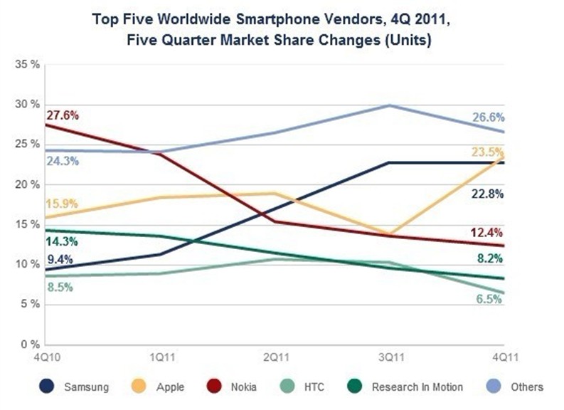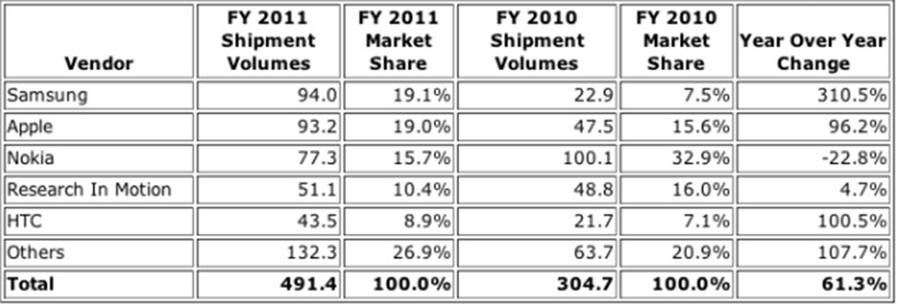 三星在第4季度完成了一系列重大的成就:首次突破了3000万台的销量大关,成为了各大智能手机企业同比增长最快的企业,同时在2011年成为了智能手机整体市场的领头羊。其Galaxy系列智能手机的市场份额进一步扩展,先后推出了针对高端市场的Galaxy S II和Galaxy Nexus,以及针对大众市场的Galaxy Ace以及Galaxy Y等。同时该公司还在Windows Phone Mango的基础上更新了其Omnia和Focus等产品。