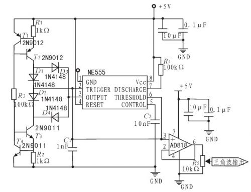 三角波产生电路如图2所示。采用NE555芯片构成三角波电路,通过恒流源对电容C1实现线性充放电从而获得三角波??脊ぷ魇?,555芯片3号脚为高电平,二极管D4导通,D3截止,从而D1导通,D2截止,由T1、T2、R1构成的恒流源通过D1对C1线性充电,当充电使C1两端电压达到2/3Vcc时,3号脚输出电平发生反转,变为低电平,此时D1、D2、D3、D4导通状态也完全相反,由下方T3、T4、R2构成的恒流源通过D2对C1线性放电,当放电使C1两端电压达1/3Vcc时,3号脚又反转为高电平,如此循环往复,实现周期三角波信号产生。由C1两端引出输出,即可得到线性度良好的三角波信号,后接一级同相跟随器已达到前后级隔离的目的。C1采用漏电流低、响应速度快的聚苯乙烯电容,保证较好性能。