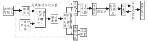 方案①:数字方案。输入信号经前置放大调理后,即由A/D采入单片机进行处理,三角波产生及与音频信号的比较均由软件部分完成,然后由单片机输出两路完全反向的PWM波给入后级功率放大部分,进行放大。此种方案硬件电路简单,但会引入较大数字噪声。