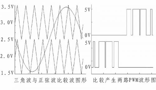 双路比较器电路采用低功耗、可单电源工作的双路比较器芯片LM393构成。此处为提高系统效率,减少后级H桥中CMOS管不必要的开合,用两路偏置不同的三角波分别与音频信号的上半部和下半部进行比较,产生两路相互对应的PWM波信号给后级驱动电路进行处理,双路比较波形图如图3所示。此处值得注意的是将上半部比较处理为音频信号接比较器的负向端、三角波信号接正向端;下半部比较则相反,这样形成相互对应,在音频信号的半部形成相应PWM波时,另半部为低电平,可保征后级H桥中的CMOS管没有不必要的开合,以减少系统功率损耗。利用电位器将上半部比较三角波偏置调至3 V,下半部比较三角波偏置调至2 V.还需注意,三角波信号应比需比较范围内的音频信号幅度稍大一些,且偏置调节要较准确,以防音频信号某些点比较不到,后续滤波还原原信号时产生失真。