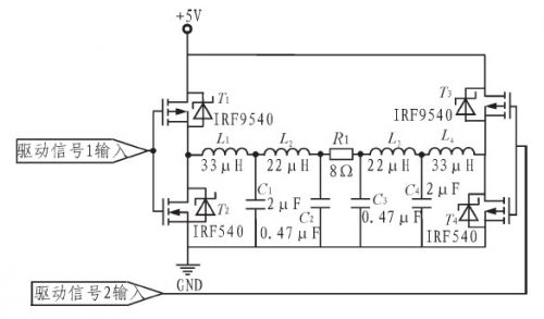 H桥互补对称电路如图4.采用低导通电阻、开关速率快、受温度影响小的场效应对管IRF9540和IRF540组成互补推挽放大电路。运用对称输出方式,充分利用电源电压,浮动输出载波峰峰值量大可达10 V,有效地提高了输出功率。