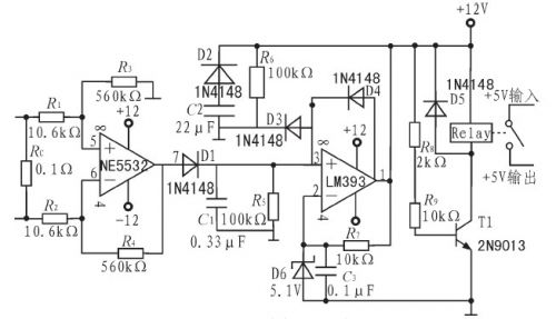 经过放大后的信号经过由D1、C1、R5组成的峰值检波部分,检出信号幅度值送至比较器与设定的基准电压进行比较。比较器选用低功耗、响应速度较快的双路比较芯片LM393.比较器负端用稳压管D6及C3、R7设置为5.1V,比较器接成迟滞比较方式,一旦过流,即可自锁。此时比较器输出的高电平使三极管T1导通,继电器的地控制端与地联通,继电器吸合,切断功放部分的供电,达到?;つ康?。因比较器自锁,所以在解决过流问题后,关断?;つ?榈牡缭?,才能重新进入?;ぷ刺2、D3、R6、C2组成开机延时电路,在断电后,C2通过D2快速放电,防止开始瞬间C2上的残余电压对3号脚影响,防止比较器在非正常状态下进入自锁状态,使?;つ?椴荒芊⒒诱W饔?。