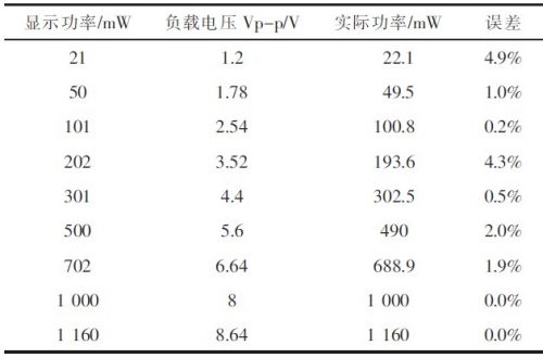 1)功率显示误差测量用Agilent信号源给出输入音频信号,示波器在单端输出测试点测负载上电压峰值Vo,据式计算出实际功率,进而计算出显示误差,结果见表1所示。