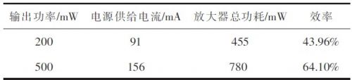 3)效率测量 用直流电源对功放电路单独供电,以便测试效率。供电电压+5 V.用与测通频带相同的方法给出给出输入信号,用示波器观察输出信号幅值,调整输出为200 mW及500 mW,将四位半数字多用表串入放大器电路中,测出电路电流I.根据式计算出功率放大器效率,结果见表2所示。