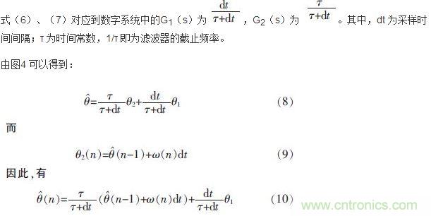 陀螺仪动态响应特性优良,解算姿态角时,由于陀螺仪低频漂移的影响,积分后低频扰动会产生较大误差;加速度计解算的姿态角会受到平衡车运行中机体高频振动的影响, 输出角度中携带较大分量的高频干扰。二者在频域上具有互补特性,采用互补滤波器对这两种传感器数据融合,可提高姿态角度测量的精度和动态响应的性能。