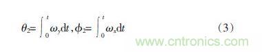 若使用陀螺仪来测量平衡车姿态角度,设陀螺仪测量载体相对惯性坐标系的x、y、z 三轴旋转角速度分别为ωx、ωy、 ωz。并定义0 时刻平衡车直立静止??傻玫礁┭鼋?theta;2和横滚角φ2估计值与ωx、ωy之间的关系如式3 所示: