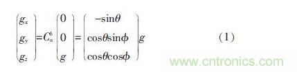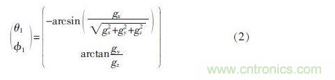 其中,Cbn为惯性坐标系到载体坐标系的变换矩阵;θ 为俯仰角;φ为横滚角;g 为重力加速度; 可以通过测量重力加速度分量gx、gy、gz,计算出平衡车俯仰角θ1和横滚角φ1估计值