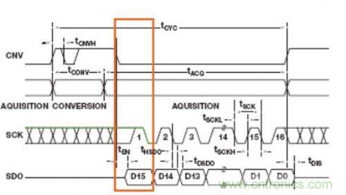 公司带SPI接口的许多SAR ADC都是从CS或CNV的下降沿为MSB提供时钟信号,剩余的数据位则跟随SCLK的下降沿,如图3所示。在读取MSB数据时,要使用等式中的tEN而非tDRV。