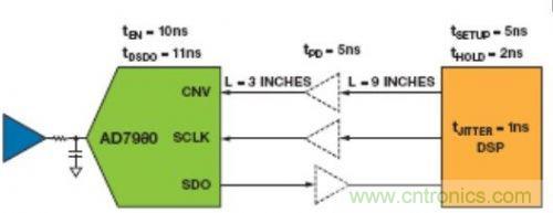 在图4中,DSP主机访问AD7980处于3线CS模式下,其中,VIO = 3.3 V。DSP锁存SCLK下降沿上的SDO信号。DSP的额定最小建立时间为5 ns,最小保持时间为2 ns。对于典型的FR-4PCB板,传播延迟约为180 ps/in。缓冲器的传播延迟为5 ns。CNV、SCLK和SDO的总传播延迟为