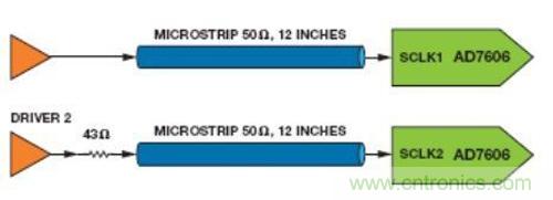 在图7中,一个驱动器通过一条12英寸的微带线路连接SCLK1,另一个驱动器通过一个与微带串联的43Ω电阻连接SCLK2。