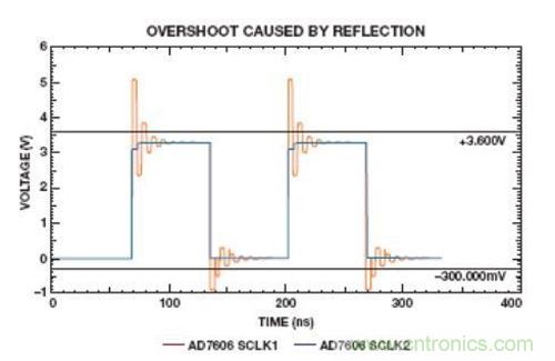 在图8中,SCLK1上的大过冲违反了–0.3 V至+3.6 V的绝对最大额定值。串联电阻可减小SCLK2上的压摆率,使信号处于额定值之内。