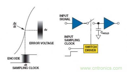 孔径或采样时钟抖动设定SNR限值,尤其是对高频输入信号。系统抖动有两个来源: 来自片内采样保持电路的孔径抖动(内部抖动),以及采样时钟上的抖动(外部抖动)??拙抖抖患涞牟裳奔浔浠狝DC的函数。采样时钟抖动通常为主要误差源,但两个源都会导致模拟输入采样时间变化,如图9所示。它们的影响难以区分。