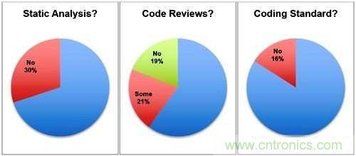 接着让我们继续更深入一点探讨:要符合产业安全性标准,可能耗费大量成本与时间,那么要实现一个优良设计的其他最佳实作呢?例如在软体设计上使用编码标准、程式码审查以及统计分析?在这个技术领域从事攸关安全装置设计的工程师受访者们的回应更令人担心了,请看下图的统计: