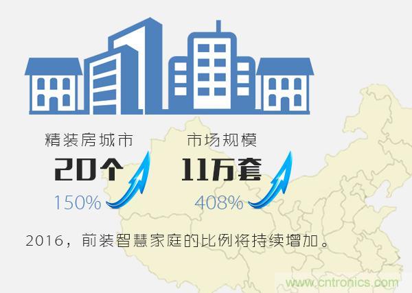 2015年各大地产商和物业公司都在推出智慧家庭和智慧社区的产品或样板,包括花样年、招商地产、金地物业、保利地产、万科等。据奥维数据显示,2015年有智能精装房的城市达到20个,同比增长150%;市场规模达到11万套,同比增长408%。2016年面对低迷的楼市,为了维持房价,商品房中前装智慧家庭的比例还会增加。