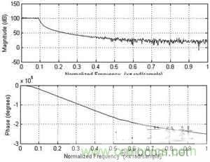 根据上面的程序,取调频斜率为400,频率控制字为10,幅度量化为10位(和所使用的D/A配合),相位累加器为24位,用Matlab仿真得到的线性调频信号的波形和相应的幅频响应如图3和图4所示。