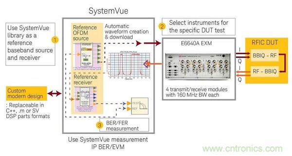 图1:图中显示初期的802.11ax装置评估流程图。流程的核心是Keysight systemVue ESL软体,它具有强大的功能及灵活性,可解决与802.11ax装置设计和测试相关的挑战。藉由SystemVue,在标准草案阶段所开发出的IP,可快速连接到各种仪器进行设计验证测试。