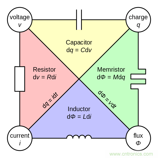 ▲ 电阻器、电容器、电感器和忆阻器概念之间的对称性。
