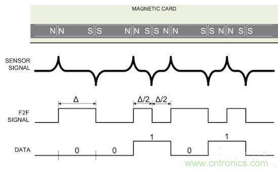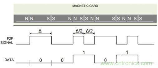 图2:用电磁体磁化磁条表示逻辑1和逻辑0,其中用到了F2F编码机制