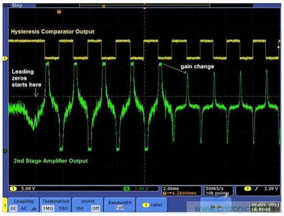 图6显示了一个完整的系统。最好将放大电路做成两级,用ADC接收第一级电路的输出。这样就无需高分辨率ADC,8位ADC就足以满足这种应用需求。第一级可以是固定增益的放大器,也可以是可变增益放大器。第二级是可变增益放大器。CPU读取ADC结果,并通过调整增益使第二级放大器的信号输出达到最佳。第二级放大器的输出送到峰值检测器/磁滞比较器电路进行峰值检测。来自检测器的脉冲输出被馈送至定时器进行时间差测量,然后由CPU解码出1和0。