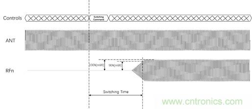 开关时间(Switch Time)或切换时间指的是开关从“导通”状态转变为“截止”状态或者从“截止”状态转变为“导通”状态所需要的时间。具体来讲是指从DUT接收到通道切换命令,到在被切换到的通道上信号的功率达到满幅度值的90%的时间。