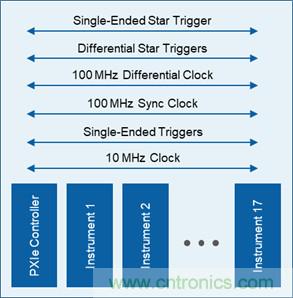 ● PXI Express保留了原始的PXI规范中的10 MHz背板时钟,以及单端PXI触发总线和长度匹配的PXI星形触发信号。