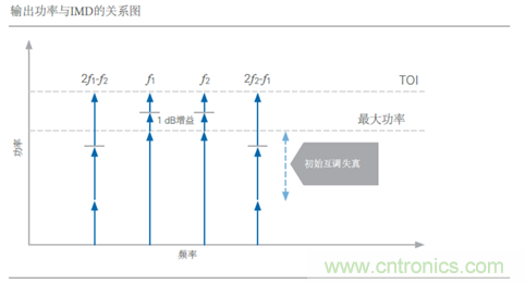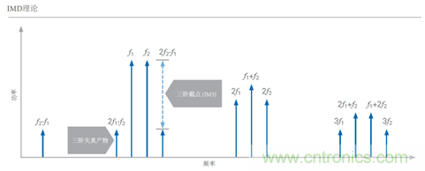 在许多器件的线性工作区域中,一阶音和三阶失真产物的比率常常很高。然而,随着基音输入功率的增加,三阶失真产物也随之增加。实际上,基音的功率每增加1 dB,互调失真产物会增加3 dB。