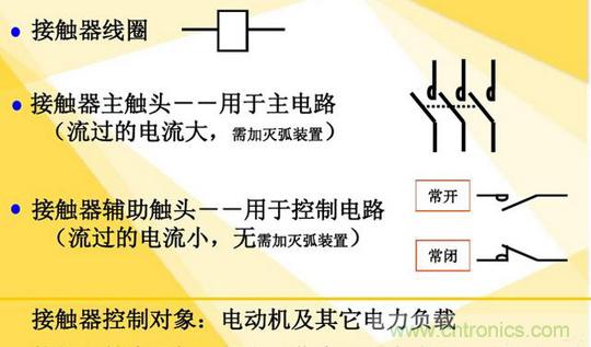 接触器用来接通或断开功率较大的负载,用在(功率)主电路中,主触头可能带有连锁接点以表示主触头的开闭状态。