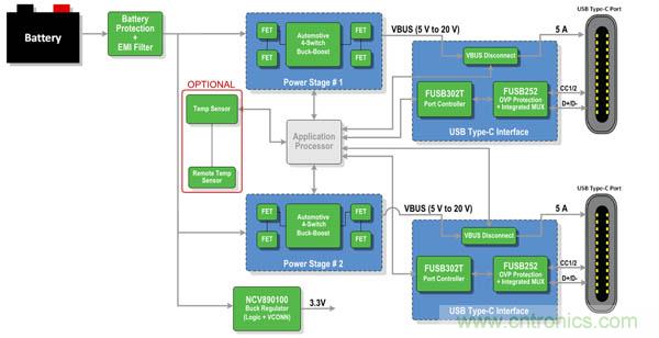 安森美半导体的FUSB302B是完全符合AEC-Q100车规的可编程的USB Type-C控制器,含电源传输,集成了一个BMC客户端配置通道,支持全Type-C PD 2.0 的1.1版本。这意味着CC可用于检测设备何时连接或未连接、主机或设备的当前功能,以及是否存在有源电缆,以及选择所需的模式(如音频适配器或调试附件模式)。图1显示了一个典型应用的框图。