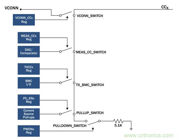 FUSB302B实施了一个CC开关,使它能够检测到它是作为设备主机还是双角色端口连接,通过多个比较器和由主机处理器上的软件控制的可编程DAC进行管理(图3)。