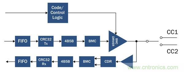 Type-C连接可正反逆插,为用户带来了更多的便利,却使开发更复杂。方向通过新的配置通道(CC)管理,该配置通道在连接器上有两个专用的引脚,并支持连接的设备协商需要提供或汲取多少电源。该通道使用的协议是一种称为双相符号编码(BMC)的差分曼彻斯特编码。USB Implementer Forum(USB-IF)定义了五个供电配置文件:10W、18W、36W、60W和100 W。使用BMC协议,电源配置文件可在含USB Type-C接口的两台设备之间进行交换。编码方案使用转换来表示逻辑电平,而不是绝对电平,并且它结合了自己的时钟信号,使得同步更简单。然而,BMC协议依赖于一个物理接口,该接口能在具电气挑战的环境中可靠地解码信号,而且很少有电气环境比车辆环境更具挑战性。
