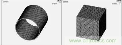 网格划分对有限元的求解及其重要,单元越小,网格越细,则离散域的近似度越好,计算结果也越精确,但计算量及误差都将增大。本文建立的线圈模型是一个规则的柱体,采用体扫掠方式划分网格。空气模型经过浇筑之后形状变得复杂,采用自由方式划分网格。图2为线圈和空气的有限元模型,最后通过numcmp命令将其浇筑在一起。