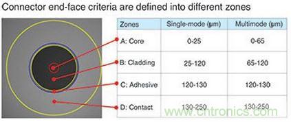 为了正确评估连接器,端面被分成从光纤芯的中心向外辐射不同的区域。由IEC 61300-3-35设定的标准定义了特定区域内可能存在的任何污垢、灰尘或划痕的特征。详细可分为MM与SM,UPC与APC,以及带状光纤连接器。当然,最严格的要求是在A区——光纤的核心(见图2)。