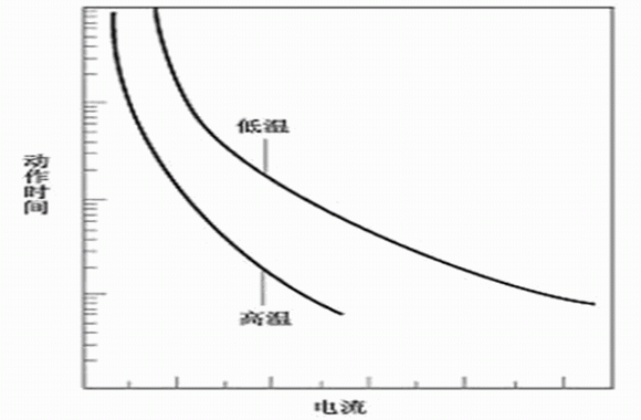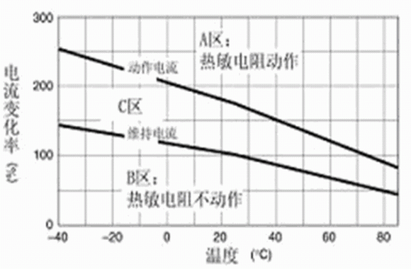 高分子PTC热敏电阻是一种直热式、阶跃型热敏电阻,其电阻变化过程与自身的发热和散热情况有关,因而其维持电流(Ihold)、动作电流(Itrip)及动作时间受环境温度影响。图4为热敏电阻典型的维持电流、动作电流与环境温度的关系示意图。当环境温度和电流处于A区时,热敏电阻发热功率大于散热功率而会动作;当环境温度和电流处于B区时发热功率小于散热功率,热敏电阻将长期处于不动作状态;当环境温度和电流处于C区时,热敏电阻的散热功率与发热功率接近,因而可能动作也可能不动作。图5为热敏电阻的动作时间与电流及环境温度的关系示意图。热敏电阻在环境温度相同时,动作时间随着电流的增加而急剧缩短;热敏电阻在环境温度相对较高时具有更短的动作时间和较小的维持电流及动作电流。