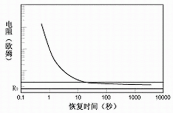 高分子PTC热敏电阻由于电阻可恢复,因而可以重复多次使用。图6为热敏电阻动作后,恢复过程中电阻随时间变化的示意图。电阻一般在十几秒到几十秒中即可恢复到初始值1.6倍左右的水平,此时热敏电阻的维持电流已经恢复到额定值,可以再次使用了。一般说来,面积和厚度较小的热敏电阻恢复相对较快;而面积和厚度较大的热敏电阻恢复相对较慢。