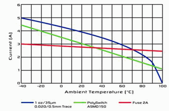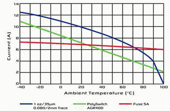 必须注意的是,在整个温度范围内,PPTC器件的触发电流是如何跟随印制线上的电流。在这两种情况中,即使可以使用熔断器,在汽车高于有用的标准温度下,尺寸最接近的熔断器也不能?;に?