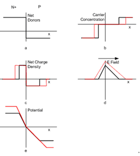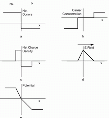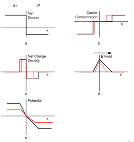 二极管的特性可以通过如图1所示的突变型PN结来做深入理解??悸堑搅狡璨牧希黄侵夭袅耸┲髟又实膎+硅,一片是轻掺了受主杂质的p硅。如图1a所示那样我们在x=0处将它们结合。n+区域电子密度等于施主杂质的数目,而P区域认为空穴密度等于受主杂质浓度,但这种静态情况将不会持续。在PN结边界处电子将和空穴重新结合,结果是导致在PN结连接处的区域电子和空隙全被耗空。这就是图1b所示的耗尽层,或者说是零载流子浓度区域。在这个连接处区域随着载流子浓度的耗尽就成为静电荷区域,如图1c。在横坐标零点左边,由于电子和右边的空穴中和从而只剩下带正电的静电荷;在零点右边,由于空穴和左边的电子中和从而只剩下带负电的静电荷。在PN结连接处的两边耗尽区的宽度依赖于两边施主杂质和受主杂质各自的掺杂浓度。有个物理现象是PN结耗尽区总的正电荷数和负电荷数一样,所以PN总体还是呈现不带电状态。 PN结连接处掺杂浓度高的一边的耗尽层宽度比掺杂浓度低的一边要窄得多。 耗尽区一定的静电荷密度的存在产生了一个电场,其场强最大的地方是PN结连接处,如图1d所示。PN结的电场存在产生了内建电压差,如图1e所示。电场和电压的存在会迫使电子向n区域移动,而空穴向p区移动。