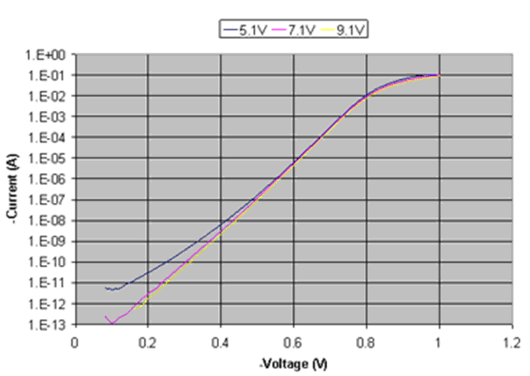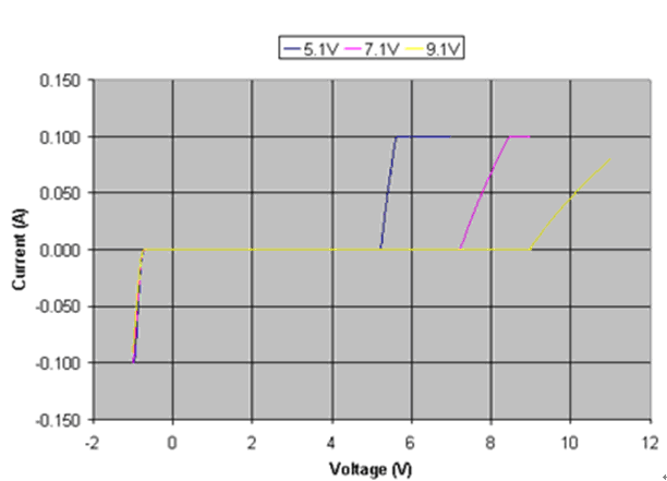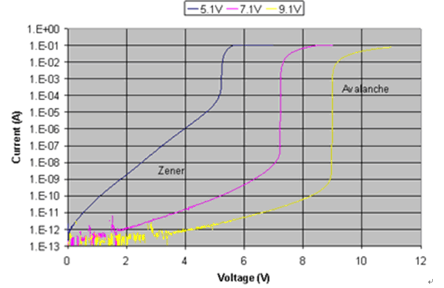 图2:具有不同的反向击穿电压的稳压二极管的I-V曲线图。电压值是n区相对于p区的电压