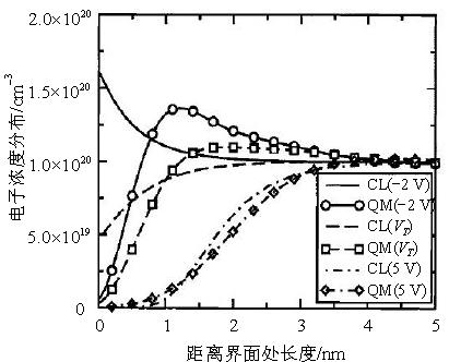 图1给出了不同的栅压下考虑多晶硅量子效应时多晶硅中载流子的分布和经典下载流子的分布,图中CL为经典描述下载流子分布,QM为考虑量子效应下载流子的分布。体原封不动掺杂为1018 cm−3,多晶硅掺杂为1020 cm−3。当所加电压为负电压和栅压为阈值电压时,量子效应下的载流子分布与经典的情况有很大的差别,而加的正电压很大时,量子情况与经典情况没有很明显的差别。这是由于在外加电压为负时,能带的突然变化对电子波函数有显著影响;而外加电压为正的时候,对电子波函数影响很小。