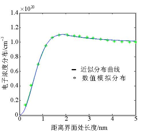 图2给出了掺杂浓度为1020 cm−3,对应栅压为阈值电压时的近似曲线与数值模拟分布曲线的对比,发现近似曲线和模拟分布曲线在所研究的区间上能很好地符合,说明近似方法具有很好的准确性。另外根据量子计算,电子分布的峰值可用电子的第一个波函数的第一个峰值处近似计算: