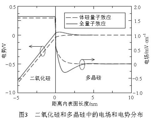 ,二氧化硅厚度为5 nm??梢钥吹娇悸嵌嗑Ч枇孔有вκ毖趸愕绯”炔豢悸嵌嗑Ч枇孔有вκ贝?,这是由于偶极子的产生使电场发生扭曲,增加了氧化层中的电场,使得在体硅中的载流子增加,也就意味着多晶硅量子效应会导致阈值电压的减小。