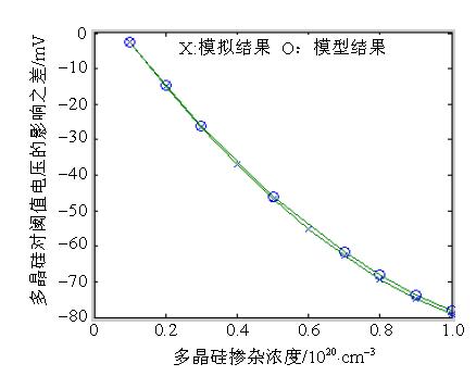 图4给出了不同的多晶硅掺杂下,考虑多晶硅量子效应相对于只考虑体硅量子效应时MOSFET阈值电压偏移的数值模拟结果与本文的模型结果。图中体硅掺杂浓度为