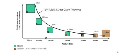 相信所有人都希望ESD防护能完全地集成到IC芯片内部,因为这样会节省的板级空间,减少系统成本并降低设计与布线的复杂度。但从目前情况来看,前景并不乐观。如今,IC制程工艺的进步成了片上ESD?;さ囊淮竽烟?。一方面,工艺的进步虽提升IC的性能与集成度并降低功耗与尺寸,但由于栅极氧化层厚度越来越薄,IC自身的ESD防护能力反而降低。另一方面,随着IC尺寸的不断减小,由于受到空间的限制,因此?;つ芰τ邢?。