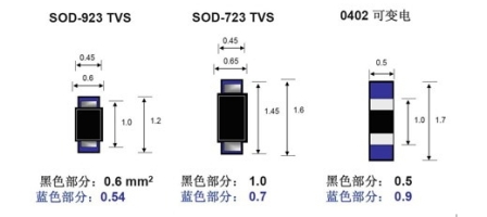图7 TVS元件与0402封装可变电阻尺寸比较,蓝色为建议焊接面积 (资料来源:安森美半导体)