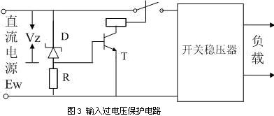 图3为用晶体管和继电器所组成的?;さ缏?,在该电路中,当输入直流电源的电压高于稳压二极管的击穿电压值时,稳压管击穿,有电流流过电阻R,使晶体管T导通,继电器动作,常闭接点断开,切断输入。输入电源的极性保护电路可以跟输入过电压?;そ岷显谝黄?构成极性保护鉴别与过电压?;さ缏?。