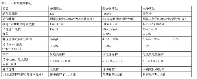 聚合物器件以导电型塑料制成,这些器件在电流(内部热量)达到预设定的电平时会改变它们的阻抗。这些器件也经常与TVS器件一起使用,就像金属熔丝那样。电子熔丝是半导体电路,控制功率开关(通常是功率MOSFET),并按照预设的参数改变其阻抗。表1简单比较了这三类熔丝。