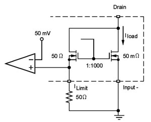电子熔丝使用SENSEFETTM来开关电源、限制电流及监测输出电流。SENSEFET的优势是仅测量小部分的负载电流。没有SENSEFET,全部负载电流将要流经感测电阻,而这将需要大功率、极低阻抗的电阻。与价格不足1美分的小型片式电阻相比,这些电阻较昂贵。