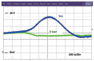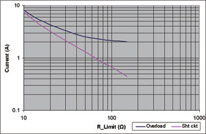 图2展示NIS5132的一对曲线。导通较低的曲线时,激活的是短路曲线。一旦电流降低至低于这个电平,FET就完全导通(线性区域),接下来面对的就是过载电平。如果电流达到过载电平,FET的栅驱动将立即减小,而漏极至源极电压将增加,并会将工作模式改为短路电平模式。这器件在过载电平时不能维持稳态工作。