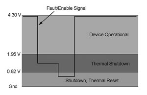目前的器件有热闩锁电路,在发生热故障时会关闭器件。然后芯片能通过下拉启用引脚至地并释放热,或是重新启动输入电源来重启。