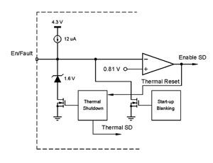 启用电路使用户能够控制器件,并在发生热关闭时提供信号。这是一种三态信号,同时发送及接收信息,能够监测这信号以检测芯片的状态。如果用户选择不用这个引脚,它只需保留在开路状态,器件会自己控制。