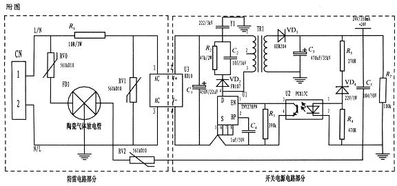 为了实现上述目的所采取的设计方案是:将压敏电阻和陶瓷气体放电管的单相并联式抗雷击浪涌电路应用到仪表的电源上。主要分为防雷电路部分和开关电源电路部分,电路简单,采用复合式对称电路,共模、差摸全?;ぃ梢圆环諰、N端连接。使压敏电阻RV1位于贴片整流??榍岸朔直鹩氲缭碙、N并联,主要来钳位L、N线间电压,压敏电阻RV0、RV2与陶瓷气体放电管FD1串联后接地,RV0与FD1串联主要是泄放L线上感应雷击浪涌电流,RV2与FD1串联主要是泄放由信号口串人24V参考电位上的能量,RV0、RV2短路失效后,FD1可将其与电源电路分离,不会导致失火现象。